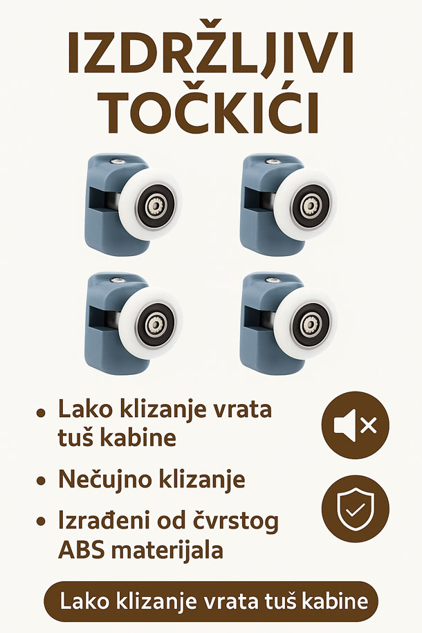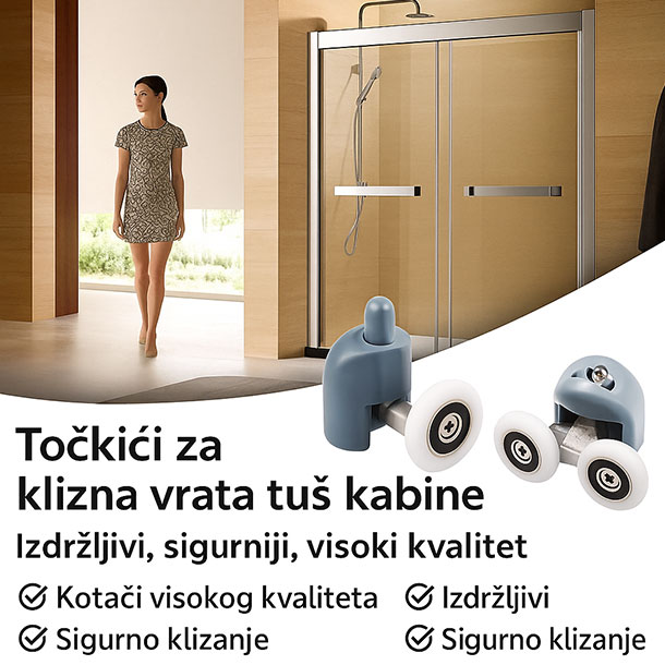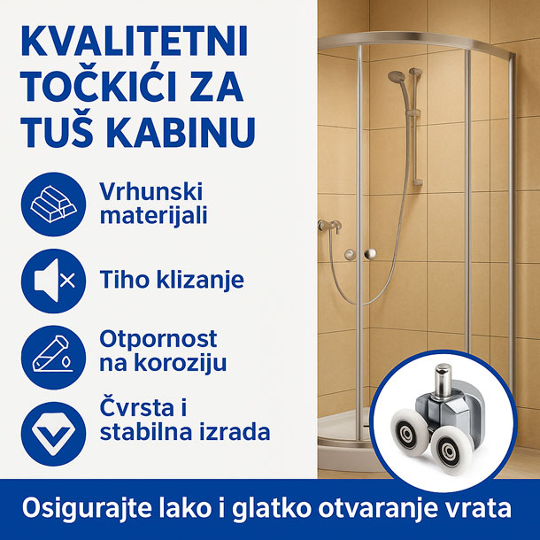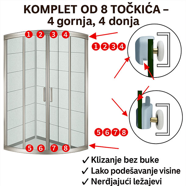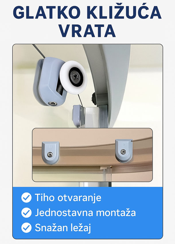Zahvaljujući preciznom klizanju i stabilnosti u vodilicama, vrata kabine se bolje zatvaraju, što smanjuje curenje vode izvan tuš kabine i pomaže u očuvanju suhog poda.