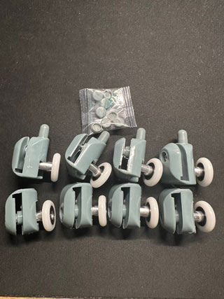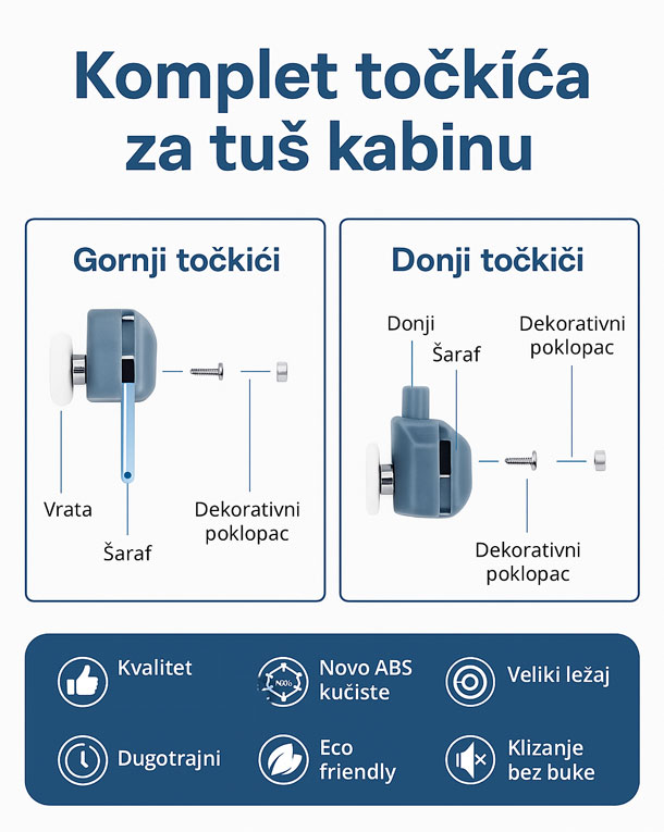 Blistavo čista tuš kabina i tiho klizanje vrata – sada je to moguće! Uz Roll Set, komplet od 4 para točkića (8 komada), vaša tuš kabina dobija potpuno novo iskustvo korištenja – bez škripe, bez zapinjanja i bez nerviranja.