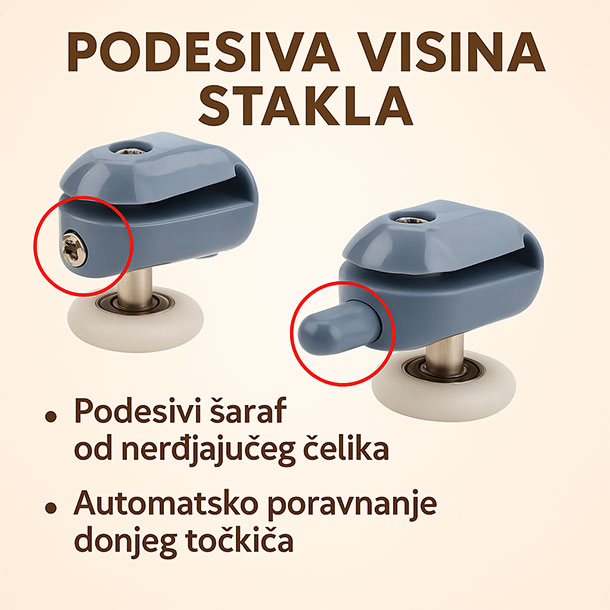 Roll Set točkići omogućavaju nečujno otvaranje i zatvaranje vrata, bez škripanja ili zapinjanja, što čini svako korištenje tuš kabine prijatnijim – posebno u večernjim satima ili kad neko spava.